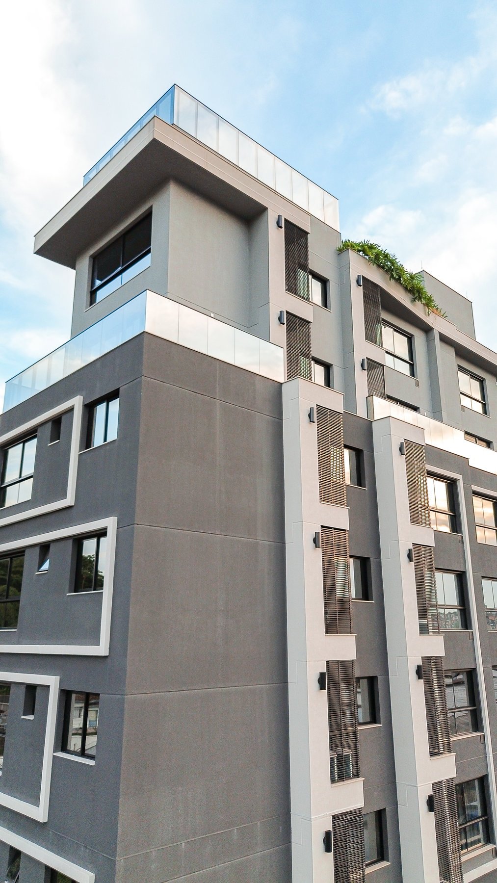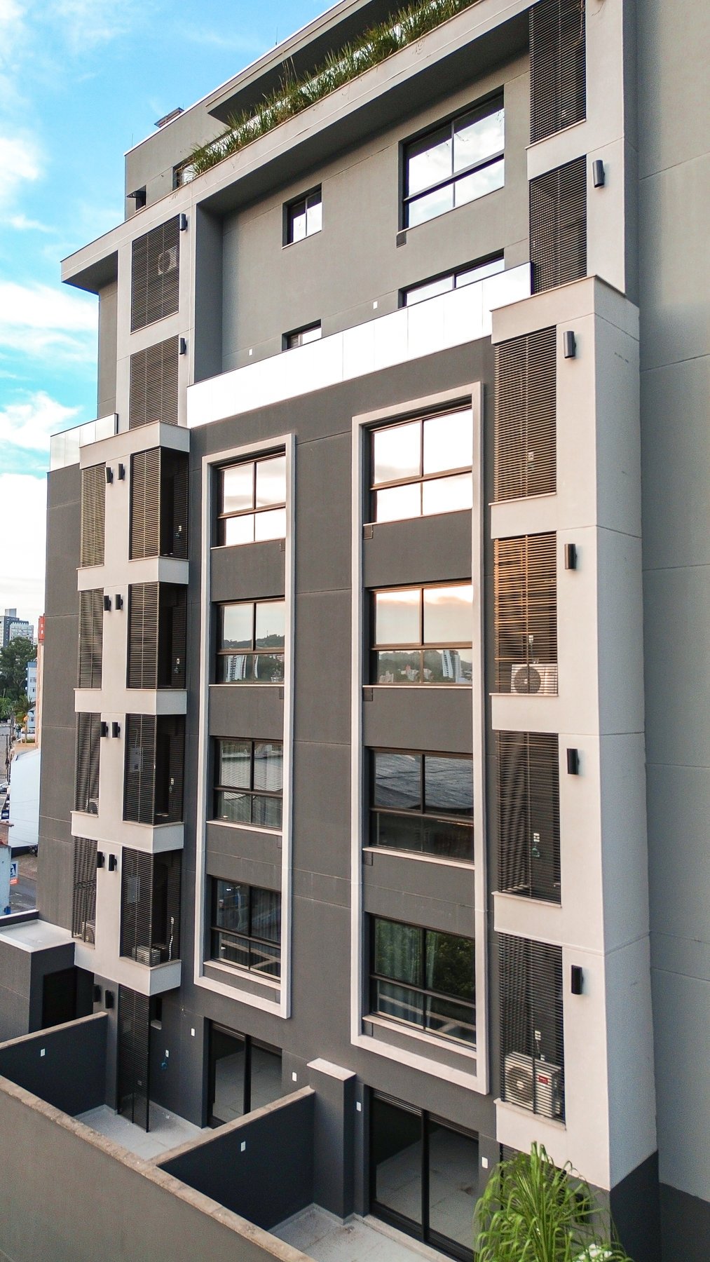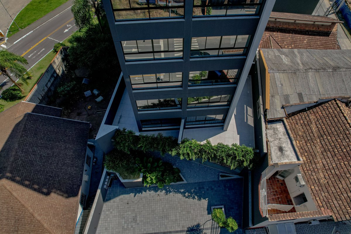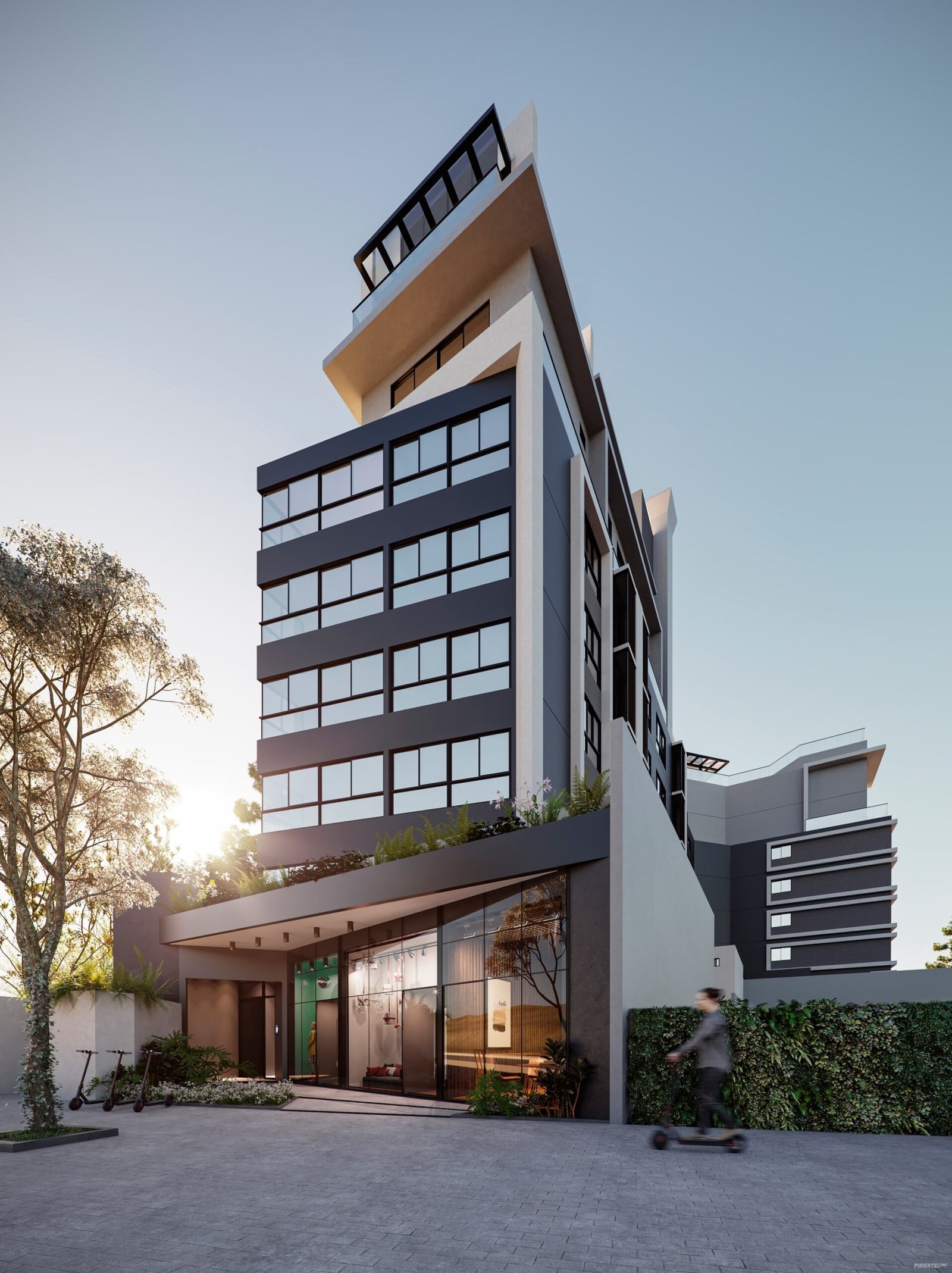 O projeto Carbono Lofts foi pensando em maximizar o uso de um terreno de 1.050 m² em formato de L com declive. Com o objetivo de oferecer mais de 50 unidades de apartamentos loft e duas lojas, cada uma com uma vaga de garagem, o design inovador do prédio escalonado nos últimos andares foi essencial. Elementos como molduras, marquises e pergolados na fachada foram utilizados para disfarçar o escalonamento e criar detalhes arquitetônicos únicos. A paleta de cores escuras, vidros espelhados e detalhes em tons claros, além de um jardim vertical, conferem ao edifício um visual moderno e sofisticado.