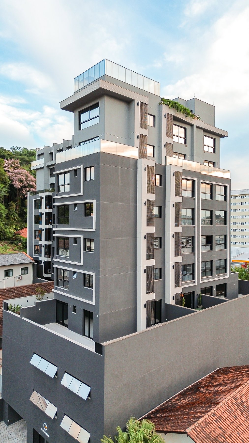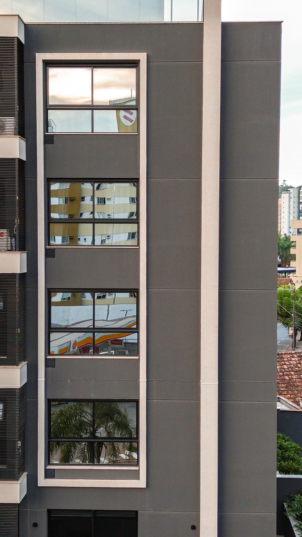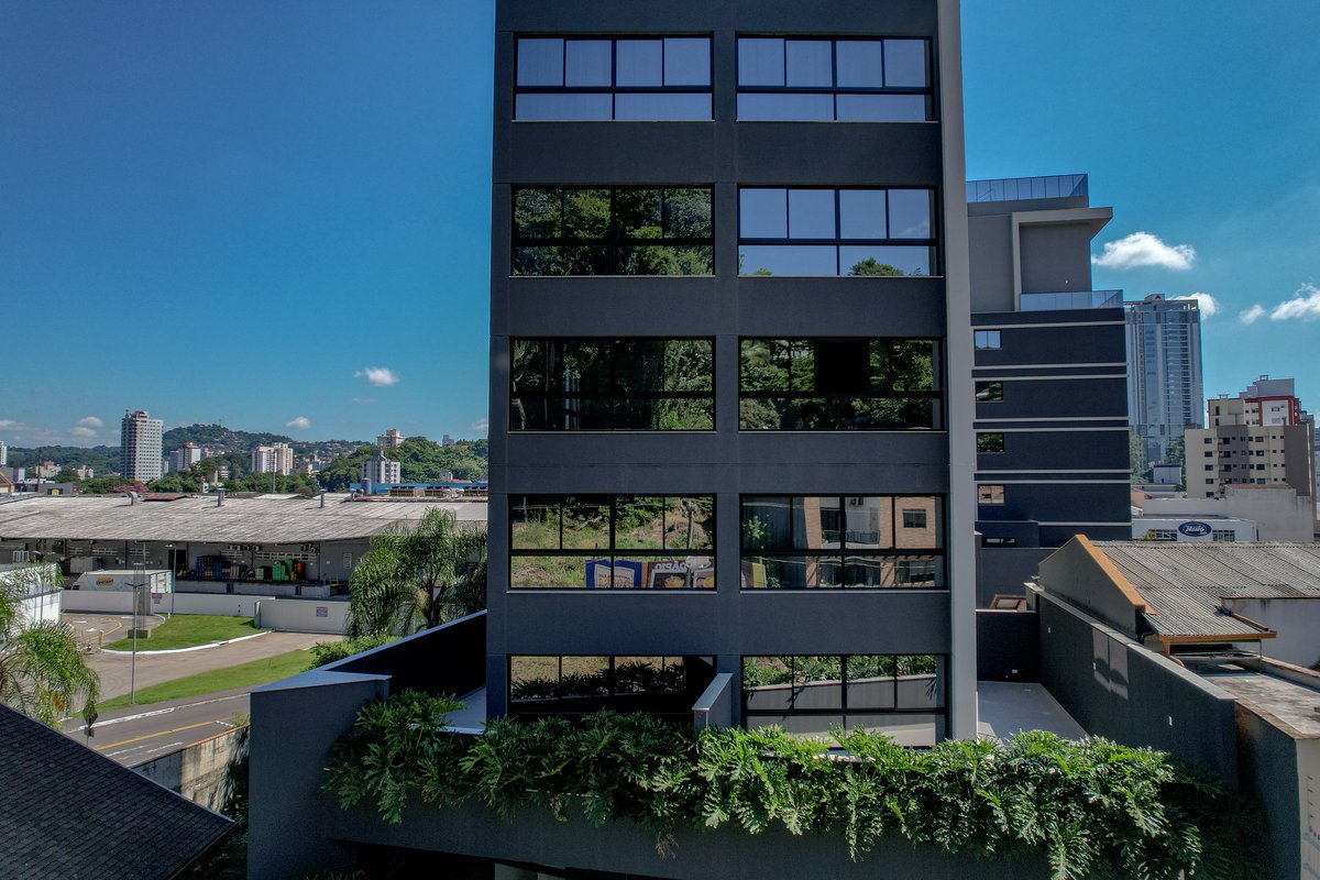 O projeto Carbono Lofts foi pensando em maximizar o uso de um terreno de 1.050 m² em formato de L com declive. Com o objetivo de oferecer mais de 50 unidades de apartamentos loft e duas lojas, cada uma com uma vaga de garagem, o design inovador do prédio escalonado nos últimos andares foi essencial. Elementos como molduras, marquises e pergolados na fachada foram utilizados para disfarçar o escalonamento e criar detalhes arquitetônicos únicos. A paleta de cores escuras, vidros espelhados e detalhes em tons claros, além de um jardim vertical, conferem ao edifício um visual moderno e sofisticado.
