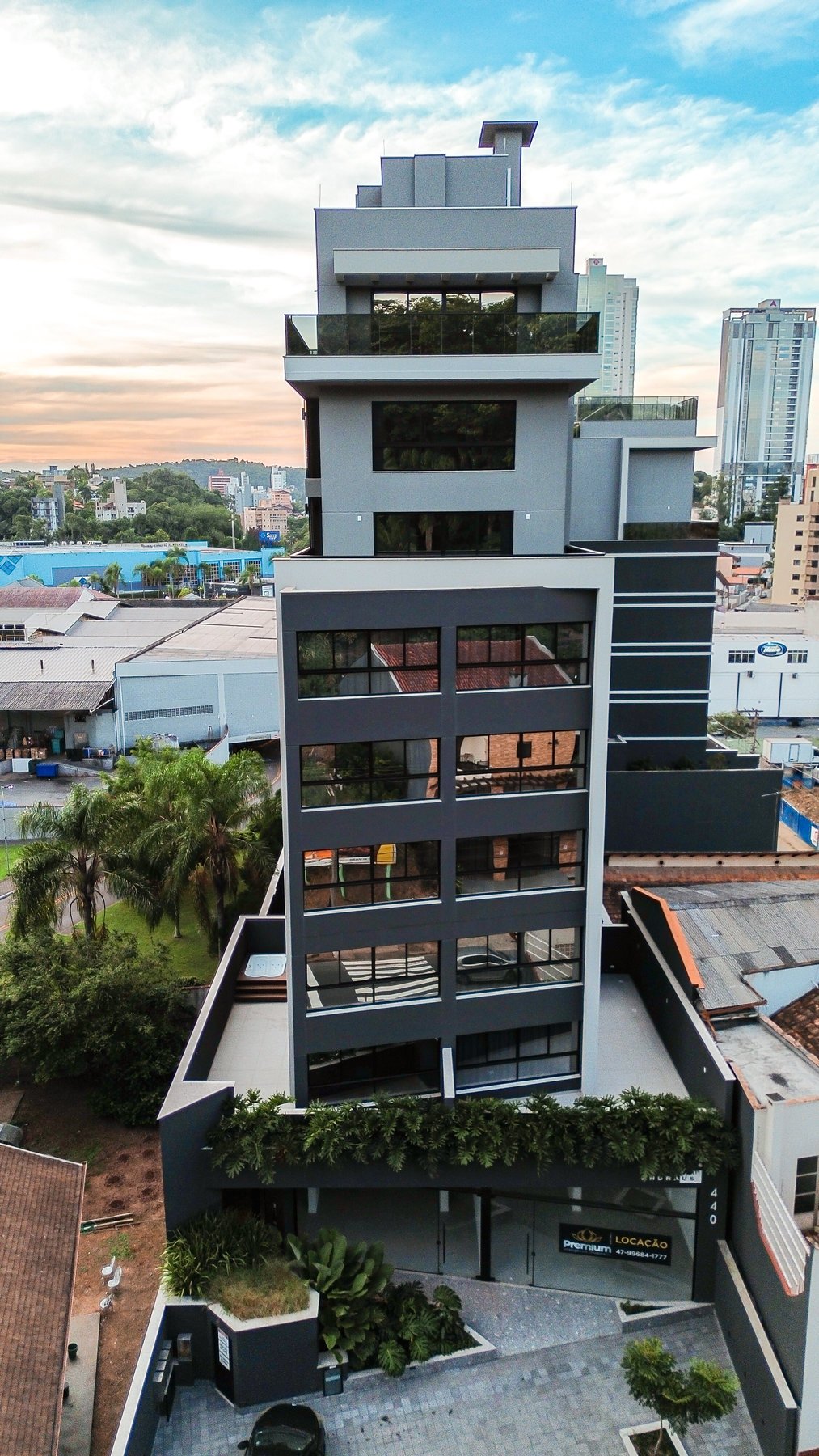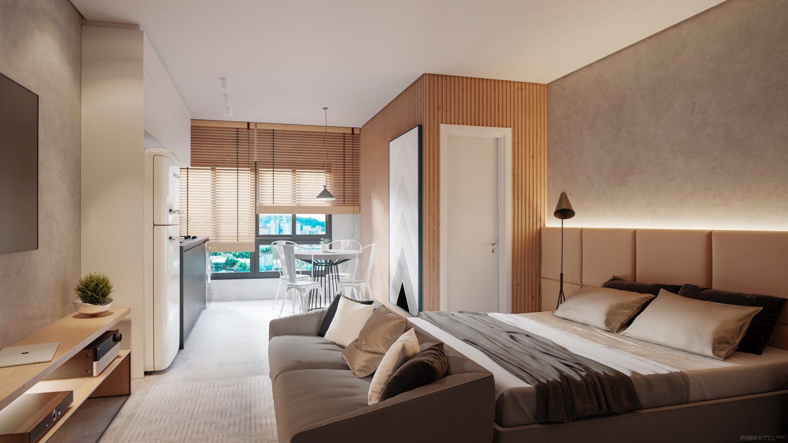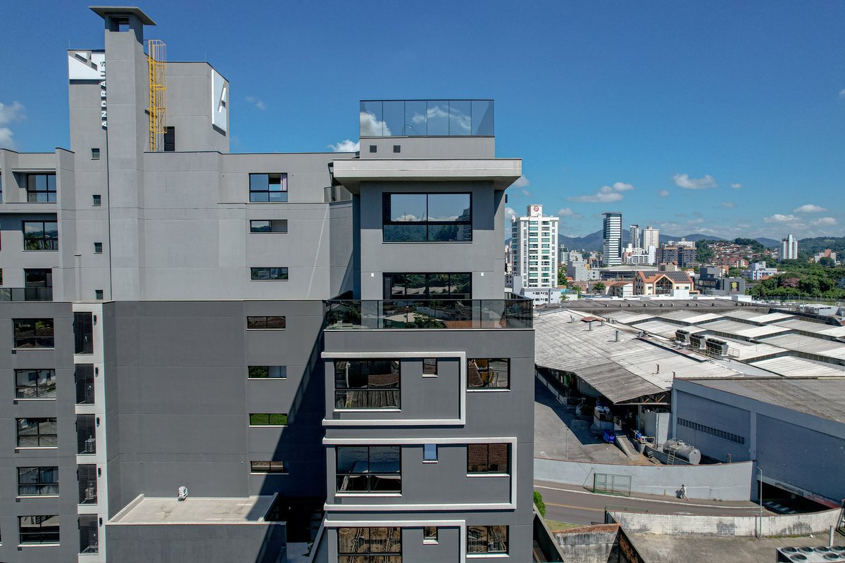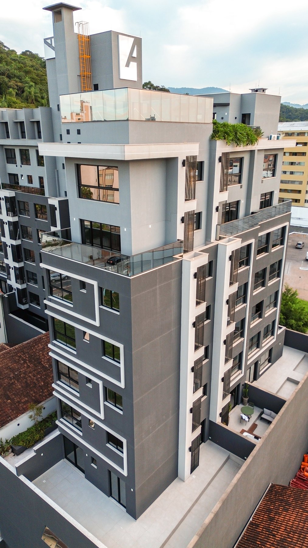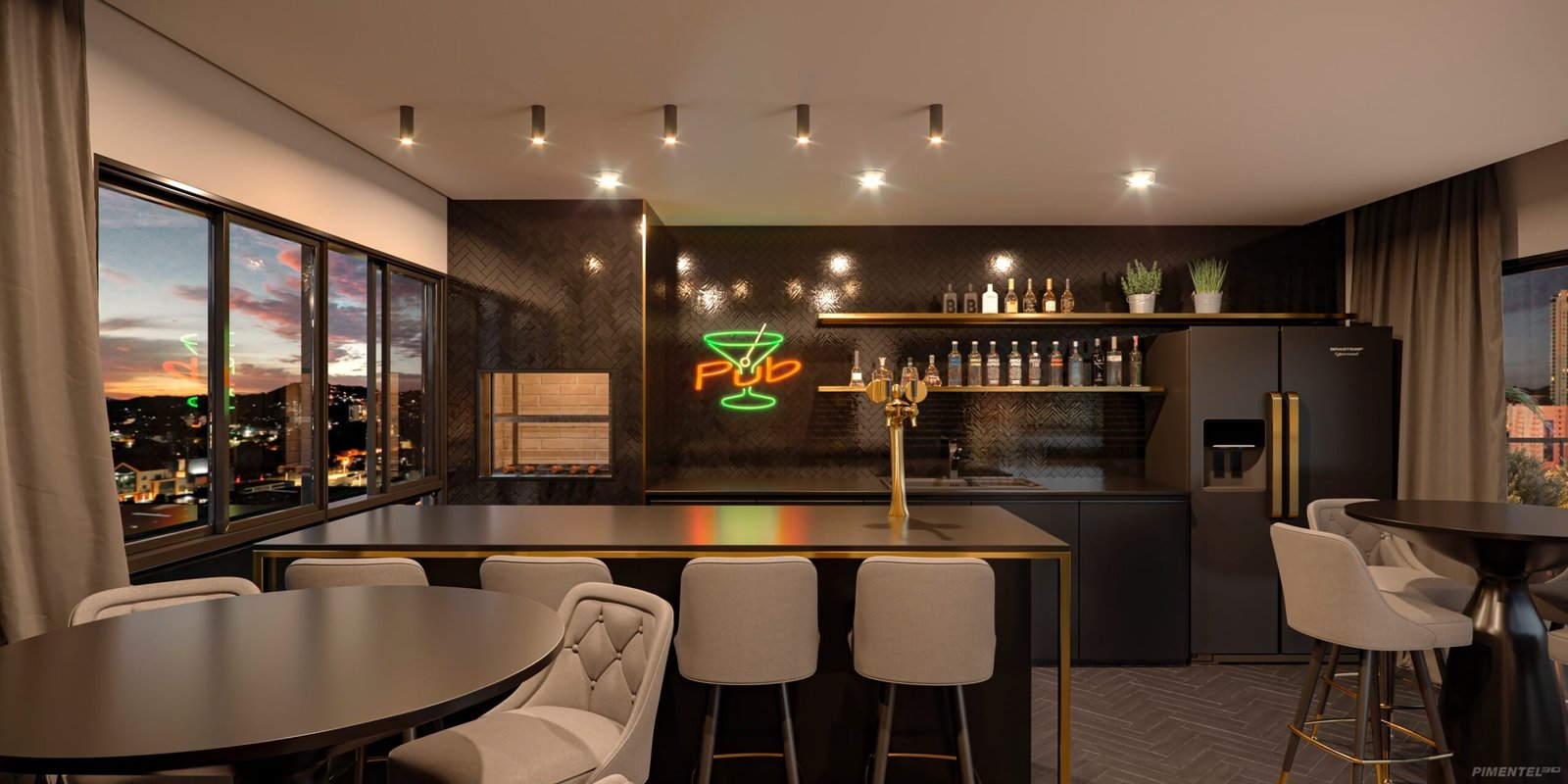 A área de lazer, localizada no rooftop, oferece uma experiência completa com sala de jogos, pub, praça do fogo, piscina, banheiros de apoio, academia, coworking, lavanderia do condomínio e horta. O projeto superou as expectativas, resultando em 59 apartamentos lofts, incluindo opções de dois dormitórios (double lofts), além das lojas e uma área de lazer excepcional.